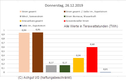 Donnerstag, 26.12.2019: Anteil Erneuerbare an der Gesamtstromerzeugung 36,17 Prozent