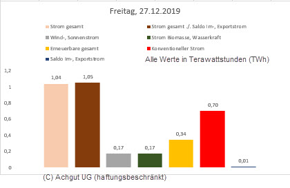 Freitag, 27.12.2019: Anteil Erneuerbare an der Gesamtstromerzeugung 32,69 Prozent