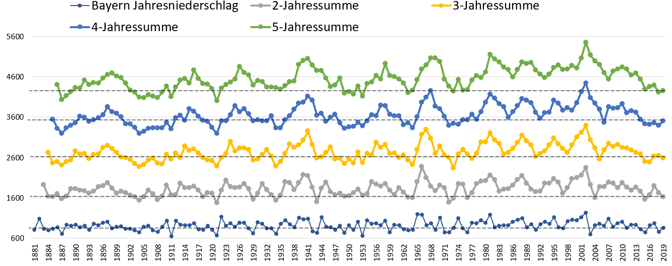In der folgenden Grafik sind für Bayern die Niederschlags-Mehrjahressummen von eins bis fünf Jahren dargestellt. Von der Jahres- bis zur 5-Jahressumme war sogar das Tief des Extremjahres 2018 früher oft erreicht und sogar unterschritten.
