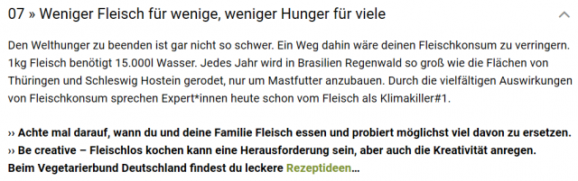 Von diesen „Tipps“ soll nur einer näher betrachtet werden: „07 Weniger Fleisch für wenige, weniger Hunger für viele“