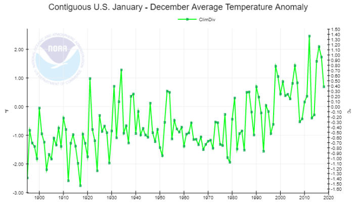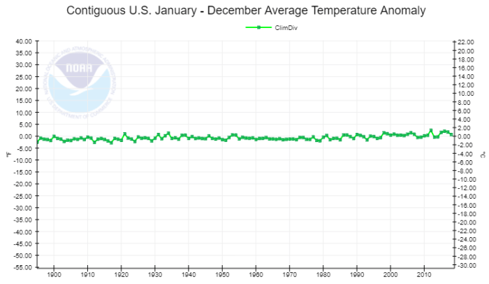 Obige Daten sind nicht von mir geplottet und auch in keiner Weise adjustiert worden. Es sind zu 100% NOAA-Daten, und die Tatsache, dass das Jahr 2019 in den US48 kühler war als das Jahr 2005 ist unbestreitbar. Die zwei großen Spitzen hängen mit El Nino-Ereignissen zusammen, welche nicht nur die USA, sondern die ganze Welt erwärmt haben.