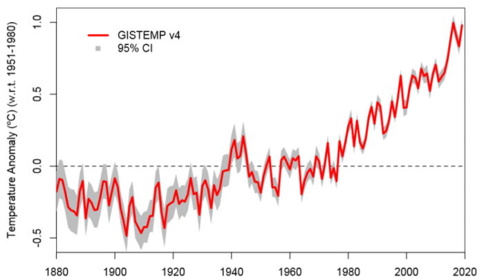 Während der letzten drei Jahrzehnte zeigt die Temperaturaufzeichnung des GISS einen Aufwärtstrend von 0,2°C pro Dekade. Insgesamt sind die Temperaturen seit dem Jahr 1880 um etwa 0,8°C gestiegen.