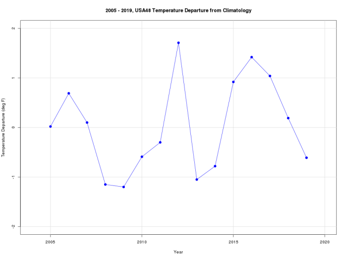 In der folgenden Graphik aus den zusammenhängenden 48 US-Staaten [US48], aktualisiert bis zum Jahr 2019, zeigt sich, dass das Jahr 2019 um etwa 0,42°C kühler war als das Anfangsjahr des Datensatzes 2005: