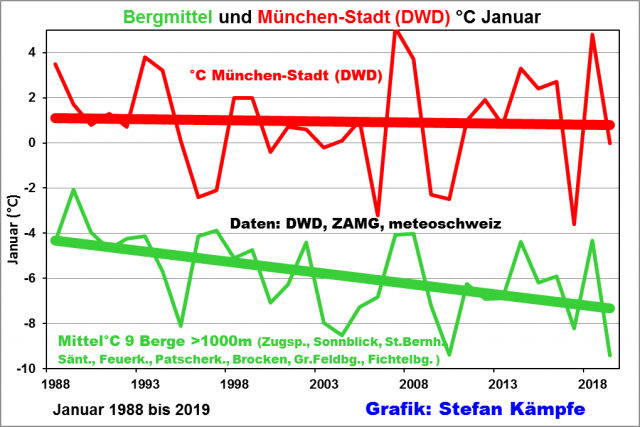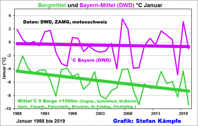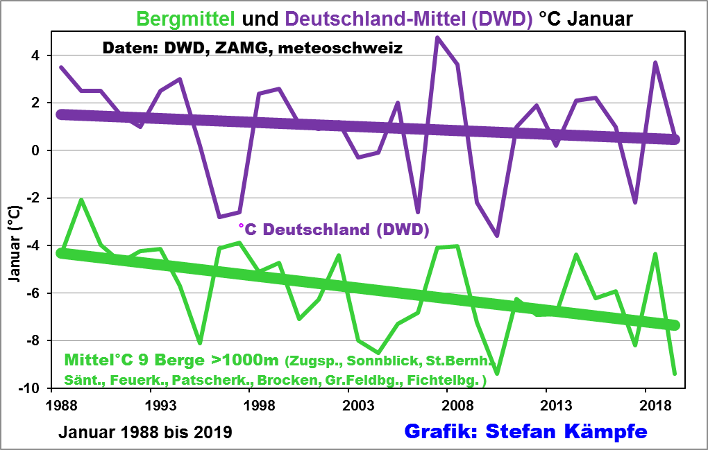 Im DWD-Mittel erwärmte sich der Januar bis zum Ende der 1980er Jahre; danach stagnierte seine Temperatur – wie auch die des ganzen Winters – auf hohem Niveau. Bei der Durchsicht der DWD-Stationen fiel jedoch ein merklich fallender Januar-Temperaturtrend nur an sehr hoch gelegenen Stationen seit dieser Zeit auf, was dazu animierte, einmal ein Mittel aus insgesamt neun Berg-Stationen über 1.000 Meter Höhenlage mit verlässlichen Daten, in Deutschland und nahe benachbart in der Schweiz und in Österreich gelegen, zu bilden und mit Stations- und Gebietsmitteln zu vergleichen: