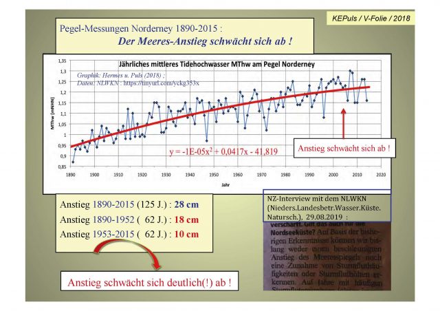 Wie man sieht, zeigen sich keinerlei Anzeichen einer Beschleunigung in den Cuxhaven-Daten. Man rufe sich ins Gedächtnis, dass wir während der letzten 30 Jahre davor gewarnt worden waren, dass der Anstieg des Meeresspiegels sich beschleunigen würde und Städte versinken würden … jedoch sieht es so aus, als hätte der Ozean das nicht mitbekommen.