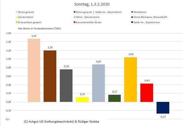 Sonntag, 1.3.2020: Anteil erneuerbare Energieträger an der Gesamtstromerzeugung 70,75%, davon Windstrom 57,17%, Sonnenstrom 7,48%, Strom Biomasse/Wasserkraft 11,56%. Die Agora-Chartmatrix: Hier klicken