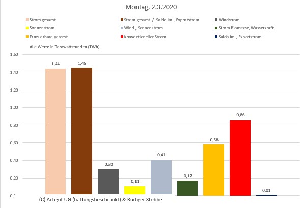 Montag, 2.3.2020: Anteil erneuerbare Energieträger an der Gesamtstromerzeugung 40,28%, davon Windstrom 20,83%, Sonnenstrom 7,64%, Strom Biomasse/Wasserkraft 11,81%. Die Agora-Chartmatrix: Hier klicken.