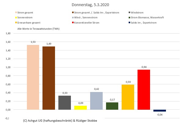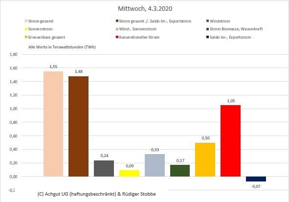 Mittwoch, 4.3.2020: Anteil erneuerbare Energieträger an der Gesamtstromerzeugung 32,26%, davon Windstrom 15,48%, Sonnenstrom 5,82%, Strom Biomasse/Wasserkraft 10,97%. Die Agora-Chartmatrix: Hier klicken.