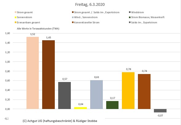 Freitag, 6.3.2020: Anteil erneuerbare Energieträger an der Gesamtstromerzeugung 51,32%, davon Windstrom 37,5%, Sonnenstrom 2,63%, Strom Biomasse/Wasserkraft 11,18%. Die Agora-Chartmatrix: Hier klicken.