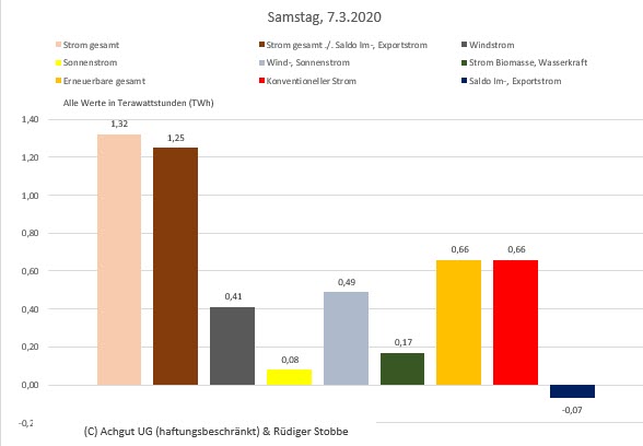 Samstag, 7.3.2020: Anteil Erneuerbare an der Gesamtstromerzeugung 50,00%, davon Windstrom 31,06% Sonnenstrom 6,06%, Strom Biomasse/Wasserkraft 12,88%. Die Agora-Chartmatrix: Hier klicken.