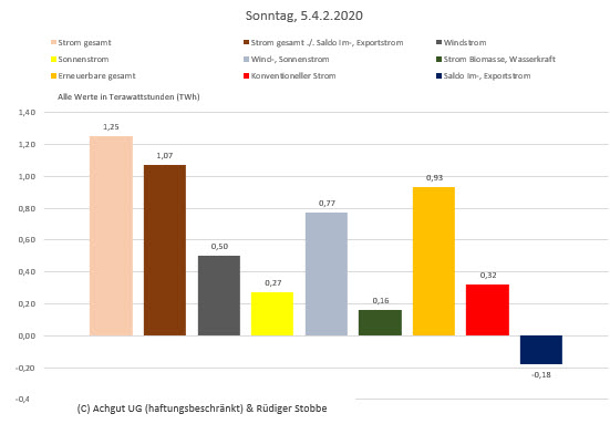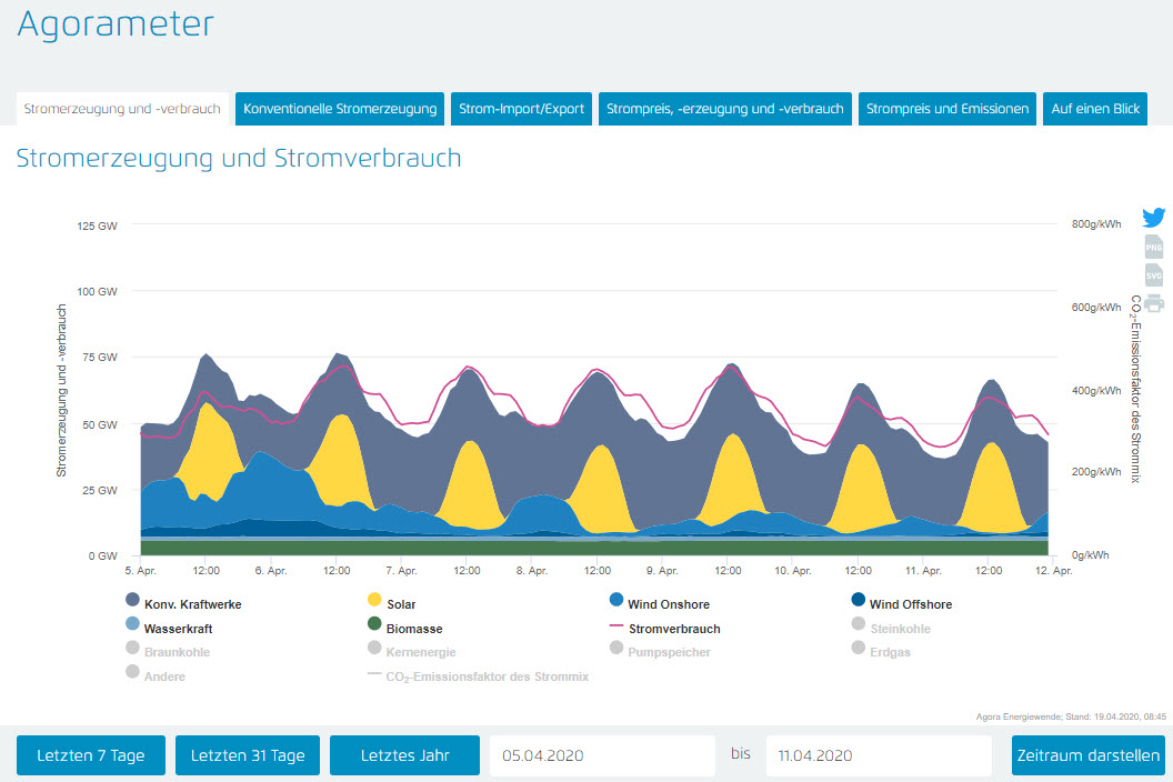 Sonntag, 5.4.2020: Anteil erneuerbare Energieträger an der Gesamtstromerzeugung 74,40%, davon Windstrom 40%, Sonnenstrom 21,60%, Strom Biomasse/Wasserkraft 12,8%. Die Agora-Chartmatrix: Hier klicken.