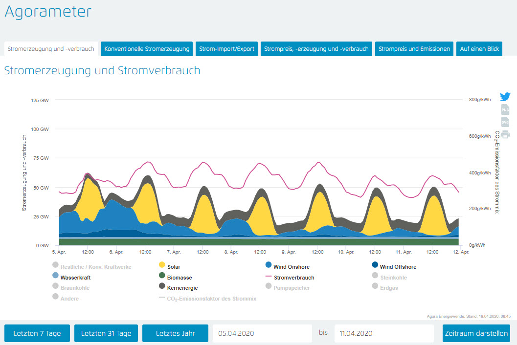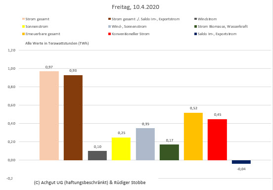 Freitag, 10.4.2020: Anteil erneuerbare Energieträger an der Gesamtstromerzeugung 53,61%, davon Windstrom 10,31%, Sonnenstrom 25,77% Strom Biomasse/Wasserkraft 17,53%. Die Agora-Chartmatrix: Hier klicken.