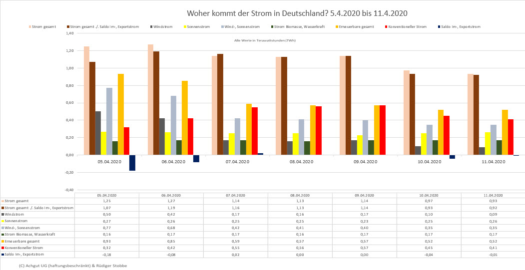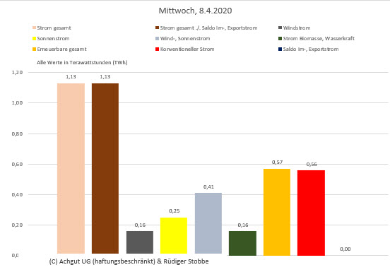 Mittwoch, 8.4.2020: Anteil erneuerbare Energieträger an der Gesamtstromerzeugung 50,44%, davon Windstrom 14,16%, Sonnenstrom 22,12%, Strom Biomasse/Wasserkraft 14,16%. Die Agora-Chartmatrix: Hier klicken.