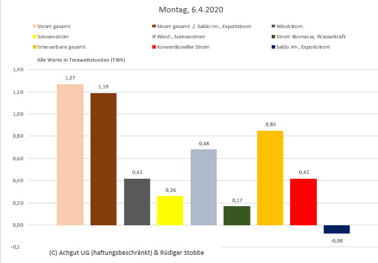 Montag, 6.4.2020: Anteil erneuerbare Energieträger an der Gesamtstromerzeugung 66,93%, davon Windstrom 33,07%, Sonnenstrom 20,47%, Strom Biomasse/Wasserkraft 13,39%. Die Agora-Chartmatrix: Hier klicken.