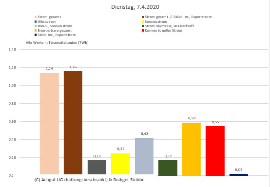 Dienstag, 7.4.2020: Anteil erneuerbare Energieträger an der Gesamtstromerzeugung 51,75%, davon Windstrom 14,91%, Sonnenstrom 21,93%, Strom Biomasse/Wasserkraft 14,91%. Die Agora-Chartmatrix: Hier klicken.