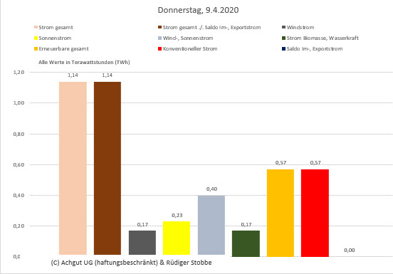 Donnerstag, 9.4.2020: Anteil erneuerbare Energieträger an der Gesamtstromerzeugung 50,00%, davon Windstrom 14,91%, Sonnenstrom 20,18%, Strom Biomasse/Wasserkraft 14,91%. Die Agora-Chartmatrix: Hier klicken.