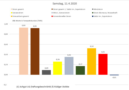 Samstag, 11.4.2020: Anteil Erneuerbare an der Gesamtstromerzeugung 55,91%, davon Windstrom 9,68% Sonnenstrom 27,96%, Strom Biomasse/Wasserkraft 18,28%. Die Agora-Chartmatrix: Hier klicken.