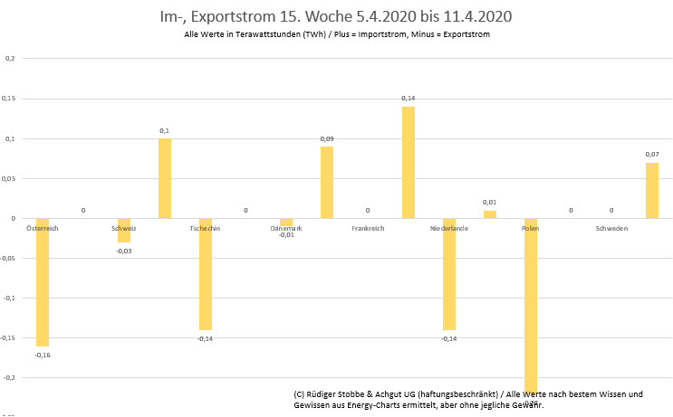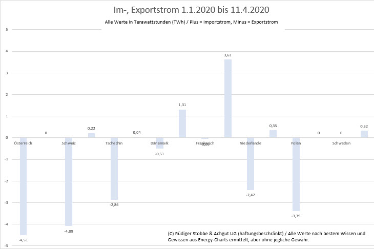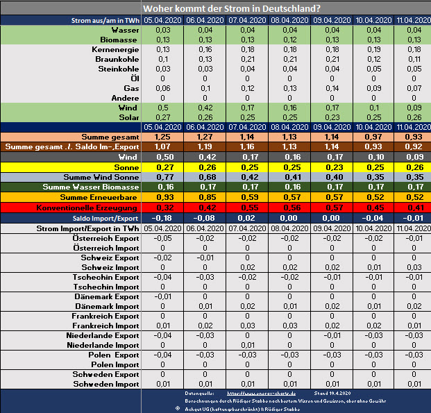 Der aus der Tabelle generierte Chart und vor allem der Im-/Exportchart des Agorameters belegen, dass Deutschland sich auch in der 15. Woche auf Stromimporte aus dem benachbarten Ausland verlässt. Vor allem Frankreich und die Schweiz liefern Strom. Strom – es ist natürlich nicht derselbe Strom –, den sie vorher günstig von Deutschland erworben haben. Oder vielleicht sogar geschenkt, mit Bonus. Wie diese Woche am 5.4.2020.