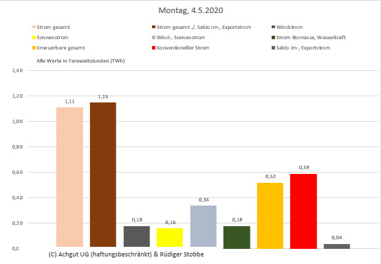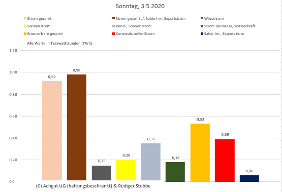 Sonntag, 3.5.2020: Anteil erneuerbare Energieträger an der Gesamtstromerzeugung 57,61 Prozent, davon Windstrom 16,30 Prozent, Sonnenstrom 21,74 Prozent, Strom Biomasse/Wasserkraft 19,57 Prozent. Die Agora-Chartmatrix: Hier klicken.