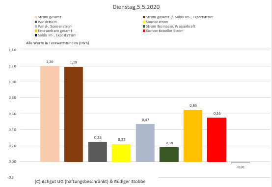 Dienstag, 5.5.2020: Anteil erneuerbare Energieträger an der Gesamtstromerzeugung 54,17 Prozent, davon Windstrom 20,83 Prozent, Sonnenstrom 18,33 Prozent, Strom Biomasse/Wasserkraft 15,00 Prozent. Die Agora-Chartmatrix: Hier klicken.