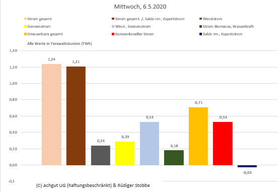 Mittwoch, 6.5.2020: Anteil erneuerbare Energieträger an der Gesamtstromerzeugung 57,26 Prozent, davon Windstrom 19,35 Prozent, Sonnenstrom 23,39 Prozent, Strom Biomasse/Wasserkraft 14,52 Prozent. Die Agora-Chartmatrix: Hier klicken.