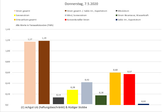Donnerstag, 7.5.2020: Anteil erneuerbare Energieträger an der Gesamtstromerzeugung 51,28 Prozent, davon Windstrom 11,97 Prozent, Sonnenstrom 23,93 Prozent, Strom Biomasse/Wasserkraft 15,38 Prozent. Die Agora-Chartmatrix: Hier klicken.