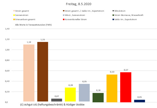 Freitag, den 8.5.2020: Anteil erneuerbare Energieträger an der Gesamtstromerzeugung 48,18 Prozent, davon Windstrom 6,36 Prozent, Sonnenstrom 25,45 Prozent, Strom Biomasse/Wasserkraft 16,36 Prozent. Die Agora-Chartmatrix: Hier klicken.