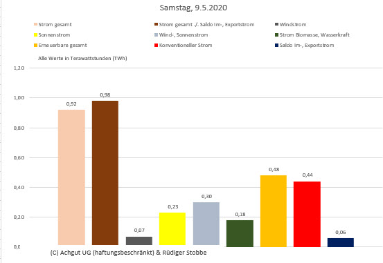 Samstag, 9.5.2020: Anteil Erneuerbare an der Gesamtstromerzeugung 62,17 Prozent, davon Windstrom 7,61 Prozent, Sonnenstrom 25,00 Prozent, Strom Biomasse/Wasserkraft 19,57 Prozent. Die Agora-Chartmatrix: Hier klicken.