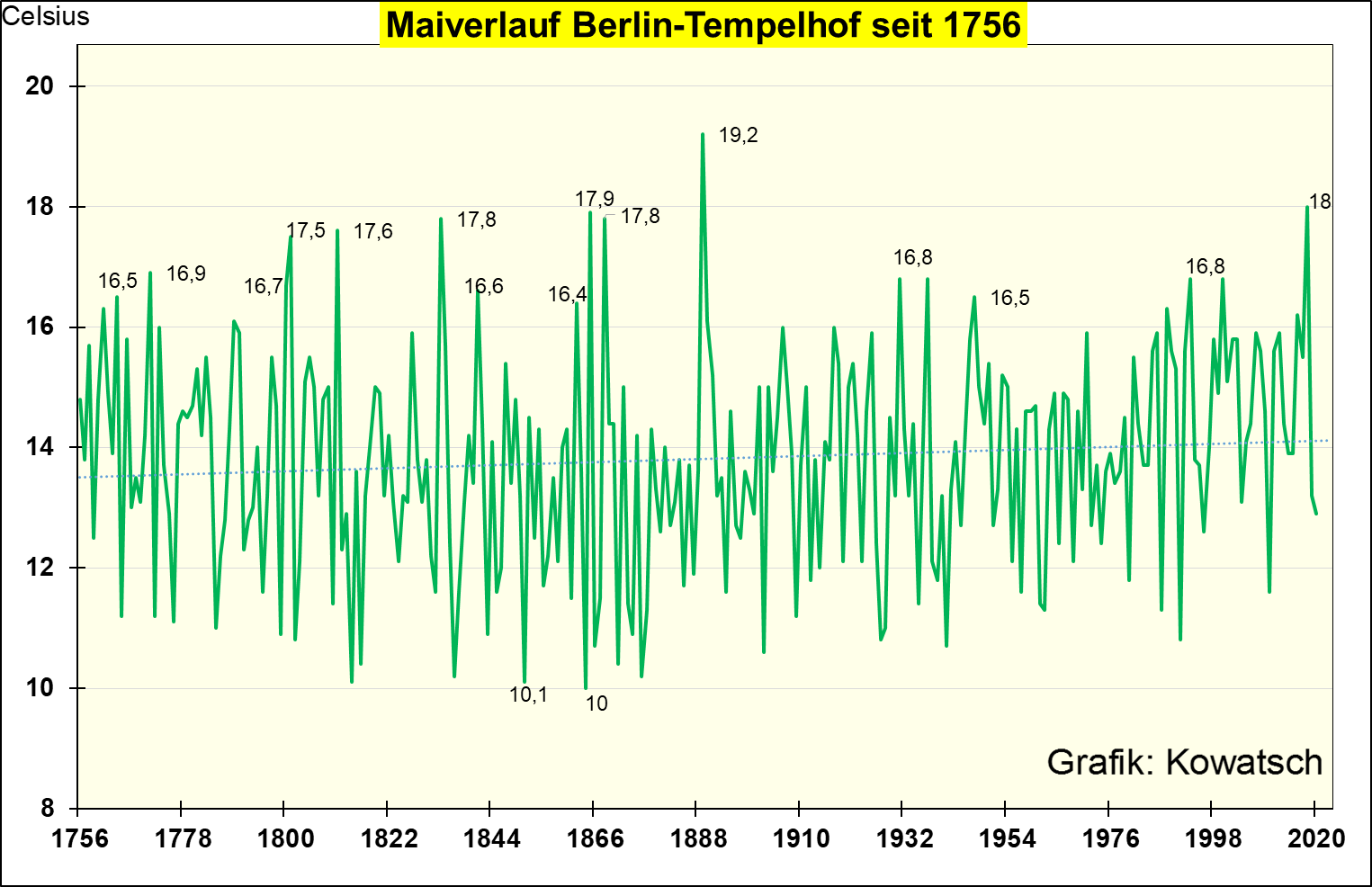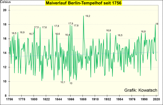 Der Mai 2020 war also kälter als die Trend-Gerade zu Beginn der Messungen. 2019 betrug die Mai-Temperatur 11,67 °C, 2018 17,18 °C. Bei solchen Schwankungen sind meiner Meinung nach Diskussionen über den Wärmeinsel-Effekt und Messfehler-Fehler bei historischen Messungen akademische Spielereien.