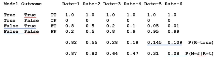 The ‘rate’ columns represent a number of possible ensembles of models differing in the badness of the incorrect models. The first lot still give relatively accurate results (incorrect models that often return the about correct result, but not always; pretty unrealistic). The last with seriously poor models which on occasion give correct results (by happy coincidence) and a number of cases in between. Obviously, if a model is correct there is no false-negative (TF) rate. The false-positive rate is given by P(R=true|M=false) = FT. The average true result expected is given by 0.1*TT + 0.9*FT = 0.82 for the first group, 0.55 for the second and so on.