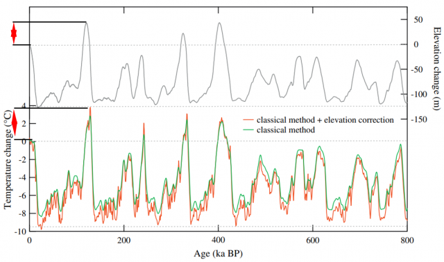 Bild 31 (Aktuelle Zeit links) Verlauf Meerespegel und Temperatur während der Eiszeiten [10] Fig. 1. Comparison of two methods to assess past EDC temperature based on EDC ice core dD. Green, conventional approach taking into account past changes in sea water isotopic composition and a constant isotope–temperature slope. Red (Jouzel et al., 2007), same as green but also including a correction for ice sheet elevation changes derived from the glaciological model used for the age scale, displayed in grey on the top panel (Parrenin et al., 2007b). Horizontal dashed lines show the average Holocene and Last Glacial Maximum levels. Vom Autor ergänzt