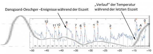 Bild 32 Typische Darstellung der Temperatur während der letzten Eiszeit (Ausschnitt von Bild 31) und darüber kopiert die Oeschger-Ereignisse. Grafik vom Autor erstellt