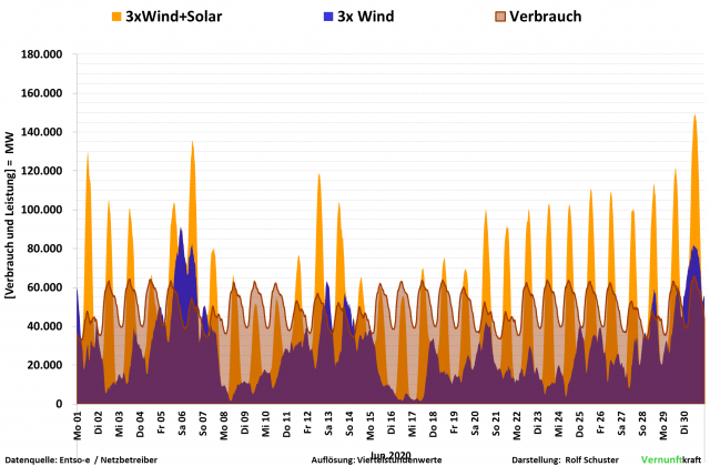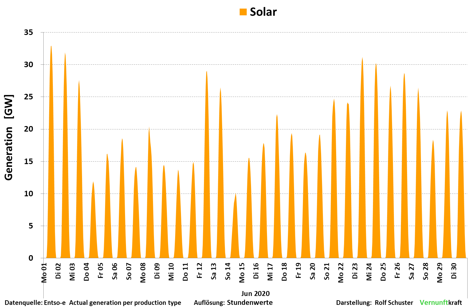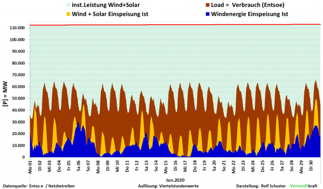 Aus der Grafik für den Juni 2020 ist das Dilemma der wetterabhängigen Erzeuger leicht ablesbar: Produktion (Blau und Gelb) haben keine Kopplung an den Bedarf (Braun). Während am Mittag des 1.6. die Leistung von Wind und Sonne fast zur Bedarfsdeckung ausgereicht hätte, sah dies an anderen Tagen wie dem 9.6. oder gar dem 17.6. ganz anders aus. Trotz einer enormen installierten Kapazität von zusammen mehr als 110 GW (Gigawatt) konnten Wind und Sonne im Minimum nur 0,634 GW bzw. 0,56% ihrer theoretischen Leistung ins Netz liefern.