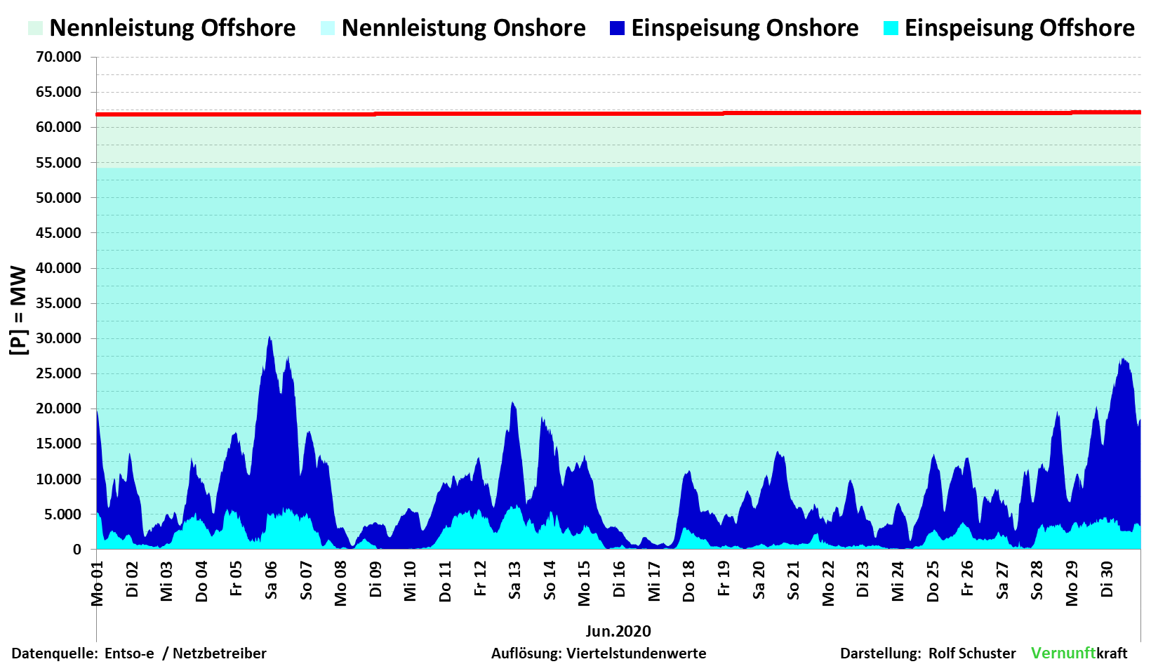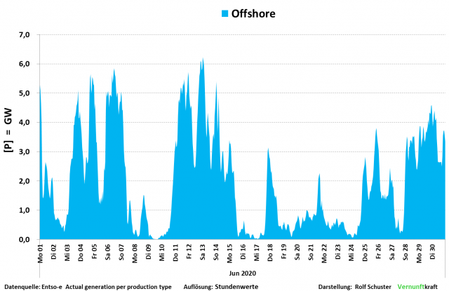 Wie sieht es dann im Gegensatz hierzu beim Windstrom aus? Vor allem beim Offshorestrom, den eine Ingenieurin vor etlichen Jahren in einer Fernsehsendung als „fast schon grundlastfähig“ anpries? Schließlich weht auf See ja bekanntlich immer ein kräftiger Wind, oder? Die Probe aufs Exempel liefert der Offshore-Stromertrag vom Juni, Bild 4.