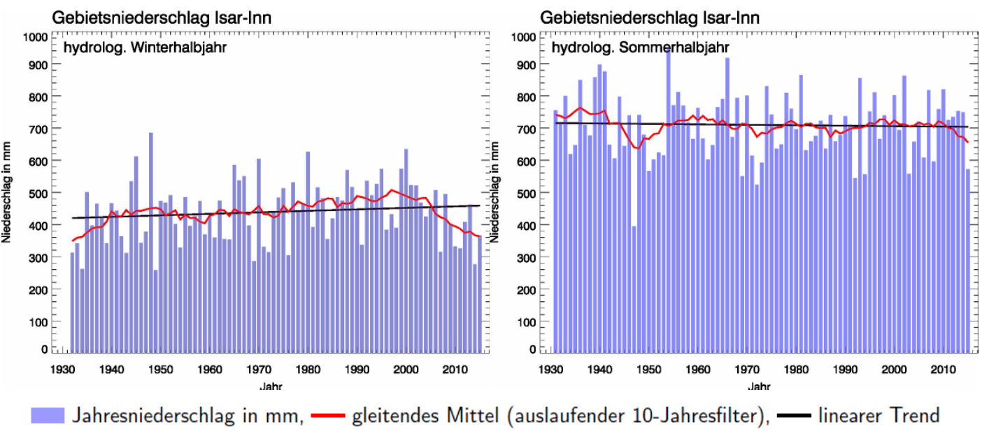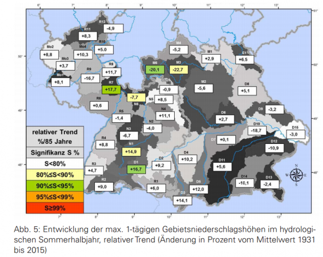 [1] … Bei den Starkniederschlägen (hier: maximale eintägige Gebietsniederschläge im jeweiligen Bezugszeitraum) zeigen die Zeitreihen der halbjährlichen Tageshöchstwerte im Winterhalbjahr von 1931 bis 2010 fast überall positive Trendwerte, die im Nordosten Bayerns über +40 % erreichen. Die Signifikanz ist allerdings unterschiedlich und variiert räumlich sehr stark. Im Sommerhalbjahr sind die Trends uneinheitlich und überwiegend nicht signifikant. Die detektierte Zunahme der winterlichen Starkniederschläge blieb seit 2000 auf dem bisher festgestellten überwiegend hohen Niveau. Eine Bestätigung der vermuteten Zunahme von kleinräumigen und kurzzeitigen Starkniederschlägen hoher Intensität ist auf Basis der vorliegenden Auswertung nicht möglich ….
