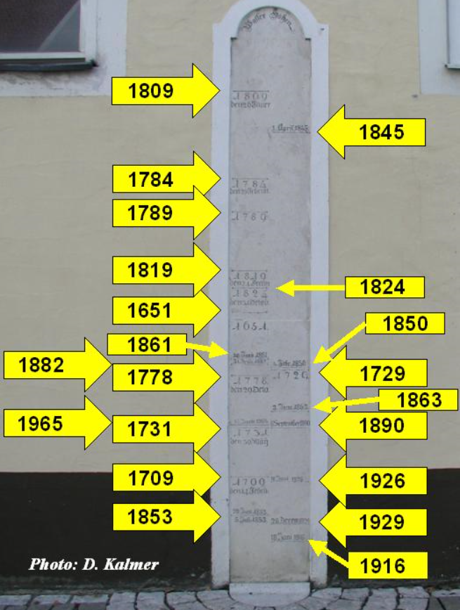 Diese Richtlinien sind sehr allgemein und können nicht jede mögliche Situation abdecken. Nehmen Sie deshalb bitte nicht an, dass das EIKE Management mit Ihnen übereinstimmt oder sonst Ihre Anmerkungen gutheißt. Wir behalten uns jederzeit das Recht vor, Anmerkungen zu filtern oder zu löschen oder zu bestreiten und dies ganz allein nach unserem Gutdünken. Wenn Sie finden, dass Ihre Anmerkung unpassend gefiltert wurde, schicken Sie uns bitte eine Mail über "Über Uns->Kontakt"Wenn man sich die Pegelstände an der Mauer anschaut und mal überlegt, daß es im Mittelalter weder Flussverbauungen gab, die die Futen in die Höhe zwangen ( Dämme und Deiche) und daß es keine Bodenversiegelungen gab, müssen damals enorme Wassermassen binnen kürzester Zeit vom Himmel gefallen sein, um so hohe Pegelstände zu erzeugen.