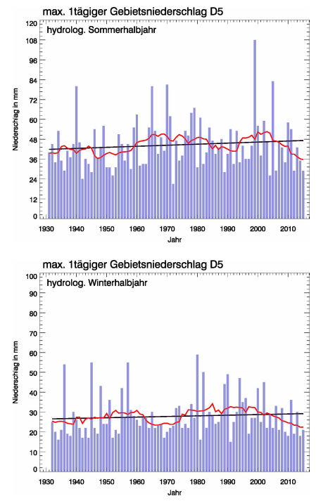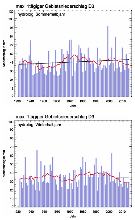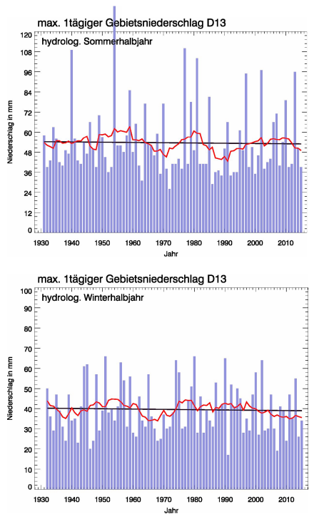 [1] … Die Trends im Starkniederschlag (Dauer=24h) sind uneinheitlicher als im Gebietsniederschlag. Hier gibt es weiterhin regional klare positive Trends im Winterhalbjahr (bis +33 %), eine Voraussetzung für eine Zunahme der winterlichen Hochwasserlagen. Im Sommerhalbjahr sind die Trends regional uneinheitlich ohne eindeutige Entwicklung, aber häufig stärker ausgeprägt als beim Gebietsniederschlag. Aussagen über Kurzzeitereignisse (< 1 Tag) konnten mit dieser Studie wegen der zu kurzen Messreihen und dem weniger dichten Messnetz mit hoher zeitlicher Auflösung nicht getroffen werden.