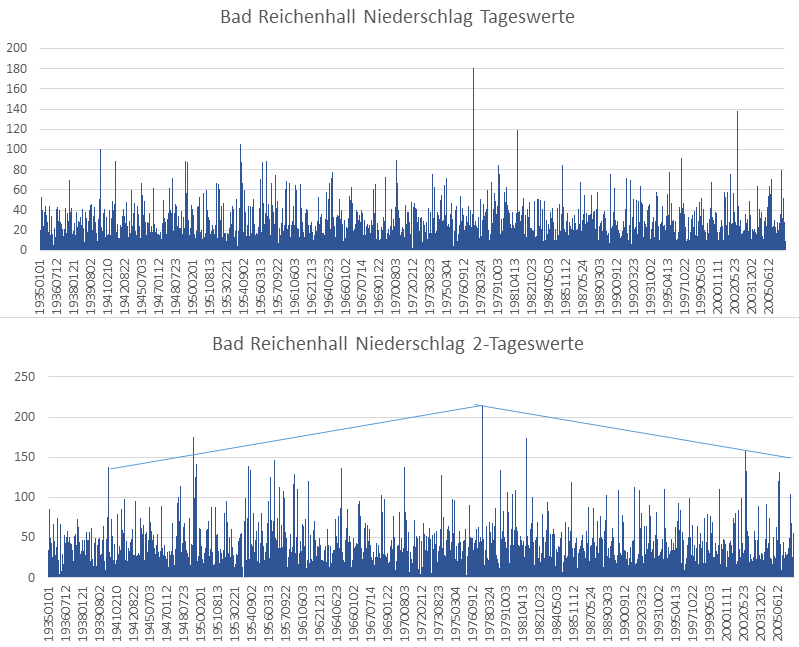 Bild 13 Bad Reichenhall: Niederschlag Tages- und 2-Tageswerte. Grafik vom Autor anhand der DWD-Daten erstellt