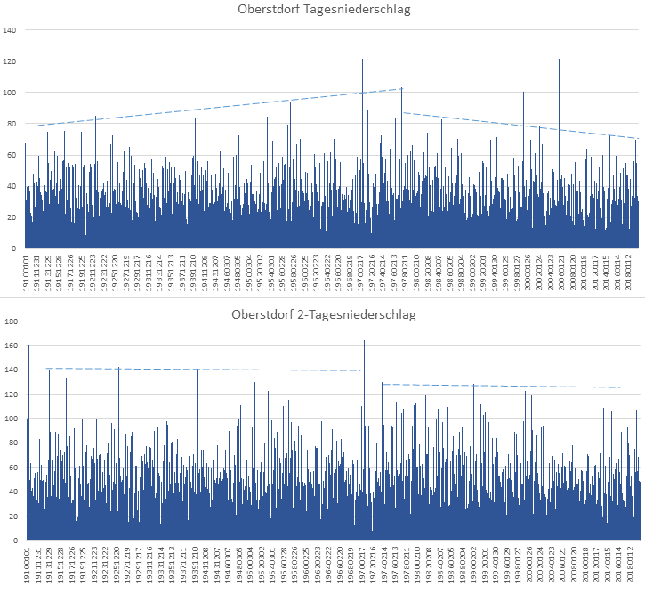 Beim Betrachten der Extrem-Tagesniederschläge fällt auf, dass in keinem Verlaufsbild eine weitere Zunahme des Mittelwertes vorkommt und häufig sogar eine Abnahme der Extreme seit ca. 2000 festzustellen ist. Was man in den folgenden Bildern nicht deutlich sieht: Eine Trendaussage ist aufgrund der extremen Variabilität und Verteilung auf kleine Umgebungen gar nicht möglich. Zudem hängt ein „Trend“ extrem vom betrachteten Zeitraum ab. Und dafür ist der „gewählte“ auf keinen Fall ausreichend.