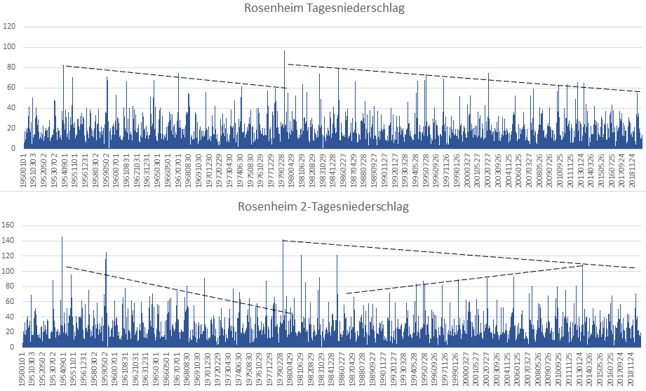 Bild 15 Rosenheim: Niederschlag Tages- und 2-Tageswerte. Grafik vom Autor anhand der DWD-Daten erstellt