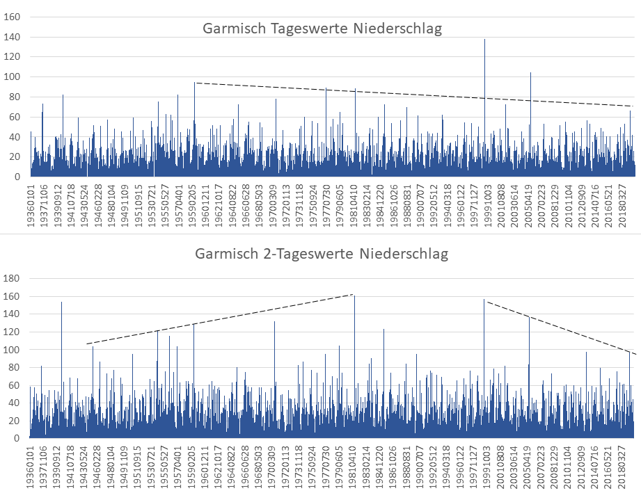 Bild 16 Garmisch: Niederschlag Tages- und 2-Tageswerte. Grafik vom Autor anhand der DWD-Daten erstellt