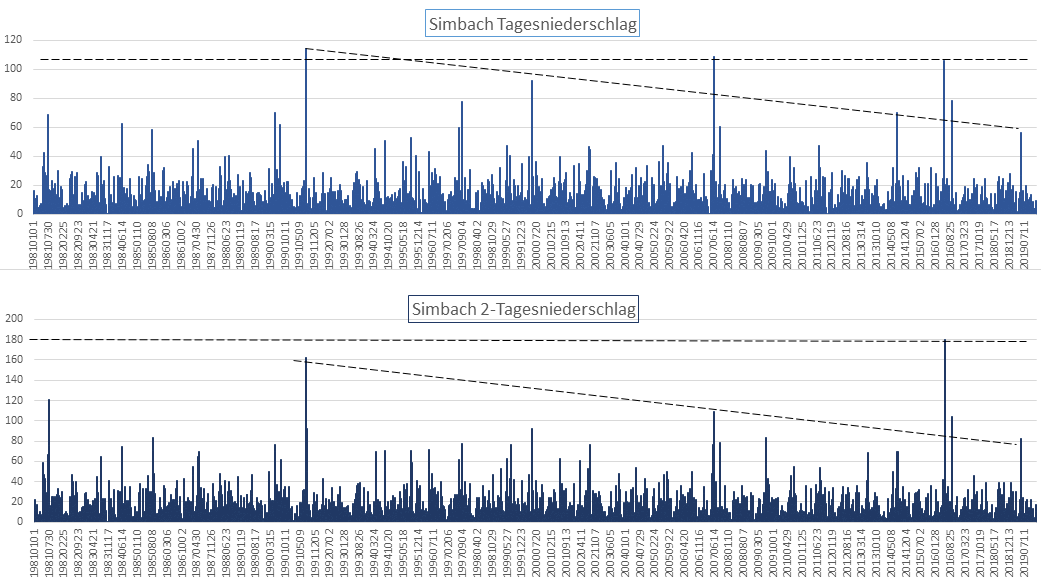 Will man das Flutereignis „Simbach“ rekonstruieren, stellt man verblüfft fest, dass der DWD den Datensatz der Messstation Simbach immer noch nicht ergänzt hat. Hintergrund: Die Station fiel kurz nach Beginn des Starkregens aus, zeigt für die zwei wichtigen Tage also eine viel zu geringe Niederschlagsmenge von lediglich 74,6 gegenüber ca. 180 mm. So viel zur Möglichkeit historischer Rekonstruktion historischer Niederschläge aus DWD-Daten.