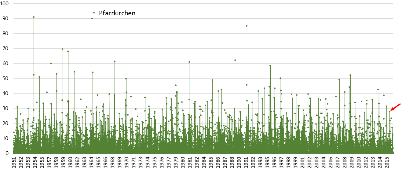 Bild 19a [8] Niederschläge Pfarrkirchen, Tageswerte seit 1951, das Extremereignis Juni 2016 gekennzeichnet. Bild vom Autor anhand der DWD-FTP-Daten erstellt