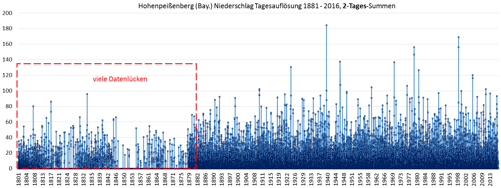 Bild 20 [8] Niederschlag Hohenpeißenberg seit 1801 – 2016, 2-Tages-Summen. Grafik vom Autor anhand der DWD-FTP-Daten erstellt