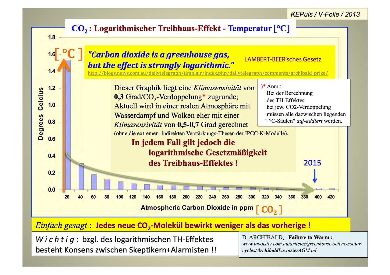 In der Skeptiker-Gruppe gibt es mehrheitlich ernst zu nehmenden Wissenschaftler, welche die physikalische Wirksamkeit der Treibhausgase betonen. Einige sehen sie eher als unerheblich an, andere weisen ihnen eine genügend große Rolle zu. Daher lautet Frage auch dort n i c h t „Ist CO2 ein Treibhausgas?“, sondern „Wie groß ist die Wirkung von CO2, insbesondere von zusätzlichem CO2 ?“. Grundsätzlich unbestritten auch beim IPCC ist: Die Wirkung von zusätzlichem (anthropogenem) CO2 muss nach einem logarithmischen Gesetz abnehmen: