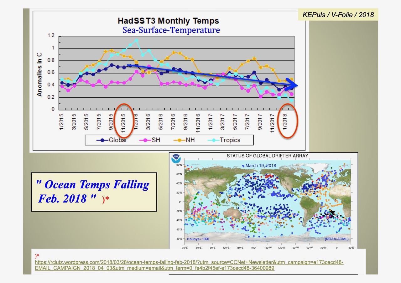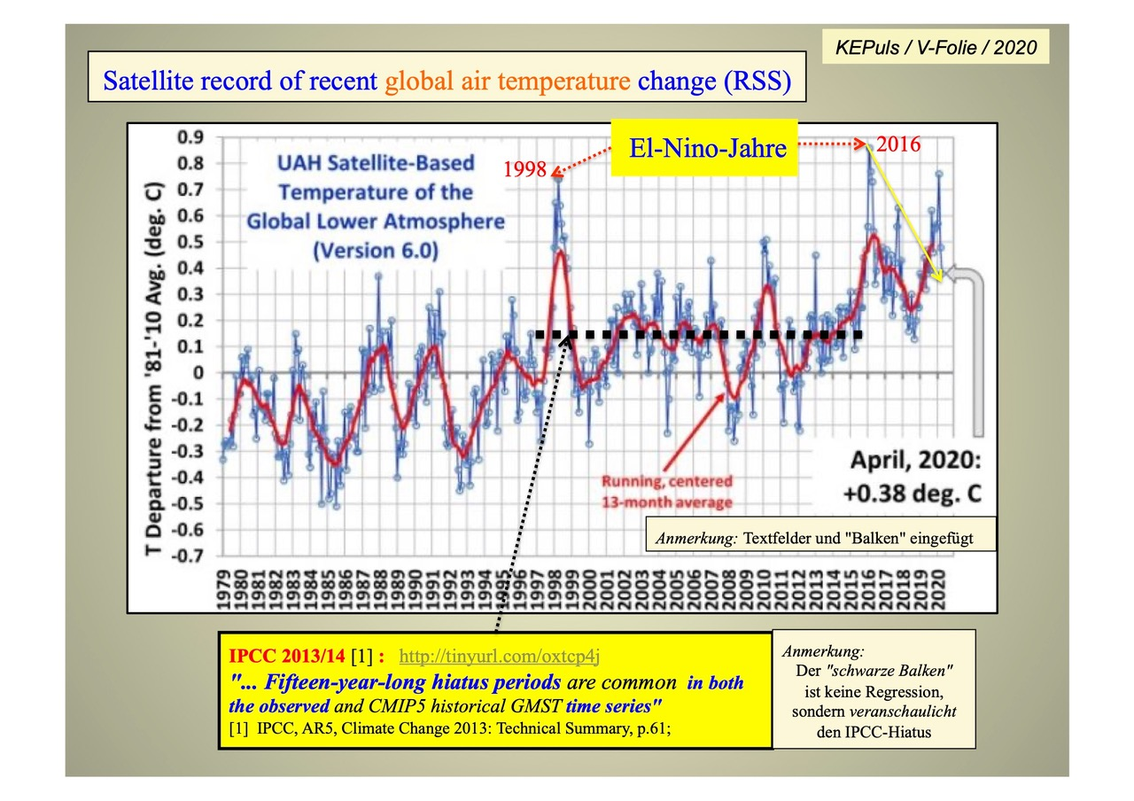 Die dort gezeigte Graphik (der unbestrittenen!) säkularen Erwärmung verbirgt den wichtigen Hinweis, dass die „Erwärmungs-Spitzen“ 1998 und 2015/16 nicht die Folge von anthropogenem CO2 sind, sondern verursacht wurden durch die Witterungs-Ereignisse „Super-El Nino“, mit der Folge, dass mittlerweile die Temperaturen wieder zurück gehen (Aktuell sind es 14,02 – ha,ha – °C):