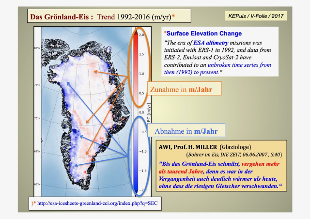 Und auch den ESA-Auswertungen des Grönländischen Eisschildes gegenüber halten die Aussagen des Referenten nicht stand, denn die zeigen in der Realität das :