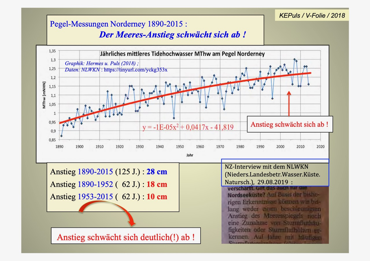 Mehr noch: Es gibt viele Regionen, in denen sich der Meeres-Anstieg abschwächt, wie z.B. an der Nordsee-Küste :