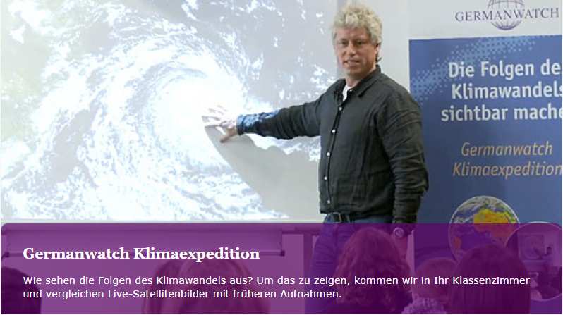 GERMANWATCH: … An Beispielen wie dem Gletscherschwund, Häufung von Starkwetterereignissen und dem Rückgang des Arktiseises machen wir Folgen des Klimawandels sichtbar. Auch die Auswirkungen des sich global ändernden Ernährungsverhaltens oder des weltweiten Rohstoffhungers werden über Satellitenbildvergleiche erfahrbar … Die Germanwatch Klimaexpedition ist für SchülerInnen der Klassen 5 bis 13 aller Schulformen geeignet, setzt in Absprache mit den LehrerInnen Schwerpunkte und kommt bundesweit an Ihre Schule …