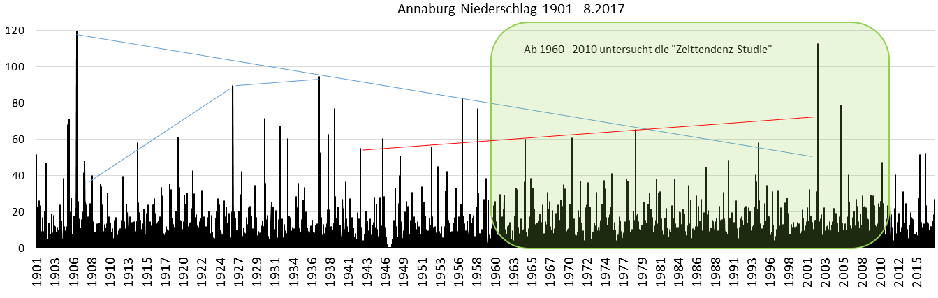 Daraus eine Grafik, wie sich Starkregen über mehr als 100 Jahre mit vielen, vermeintlichen Kurzfristtrends und Einzelereignissen verteilt, ohne jedoch einen Langfristtrend auszuweisen.